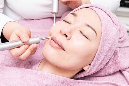 (低周波刺激により表情筋を引き締め、タルミやシワの改善施術)